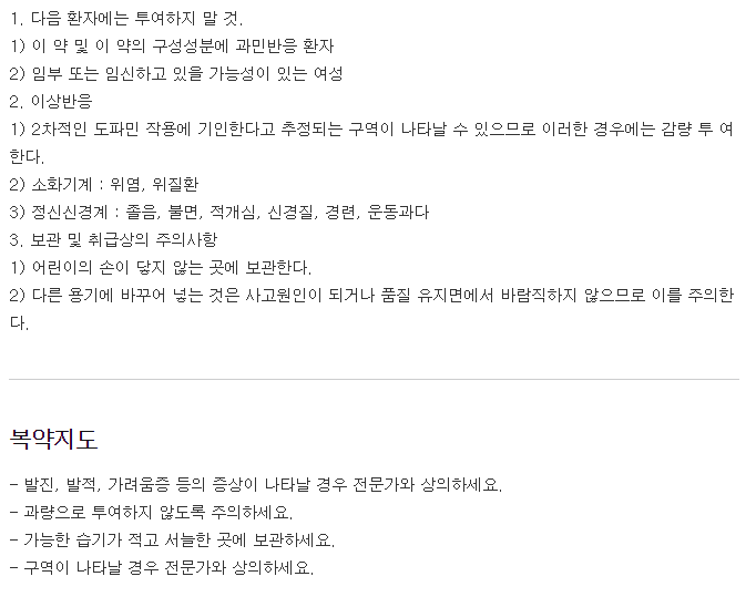 약물 복용 시에는 약품 안내서를 꼼꼼히 읽어 보길 바라며, 조금이라도 이상반응이 느껴진다면 약품 복용을 즉시 멈추고 반드시 의사와 상담을 통해 질병을 치료하셔야 합니다.