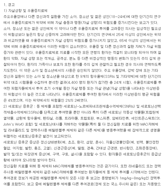 약물 복용 시 약품 안내서를 면밀히 읽어 보길 바라며, 조금이라도 이상한 반응이 나타난다면 약품 복용을 즉시 중단하시고 빠른 시일 내에 전문의와 진료와 상담을 통해 질병을 치료하셔야 합니다.