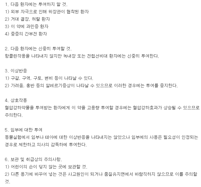 약물 복용 시 약품 안내서를 자세히 읽어 보시기 바라며, 조금이라도 이상한 반응이 느껴진다면 복용을 즉시 멈추시고 빠른 시일 내에 전문의와 진료와 상담을 통해 질병을 치료하셔야 합니다.