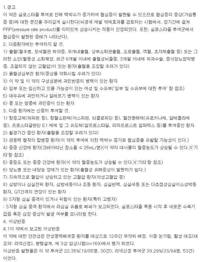 약품 성분별 약 효능으로는 Cilostazol : 혈액 및 조혈기관 질환 > 항응고제 > 항혈소판제 > Phosphodiesterase 억제의 효능을 나타내고 있습니다.
