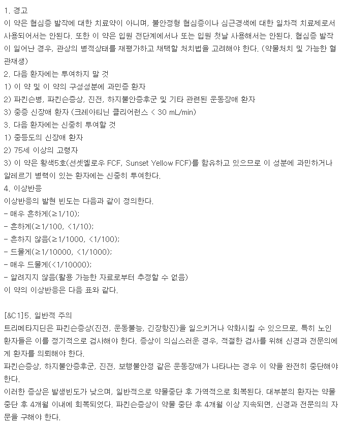 의약품 성분별 효능으로는 Trimetazidine Hydrochloride : 순환기계질환 > 협심증 치료제 > 기타의 약 효능을 나타내고 있습니다.