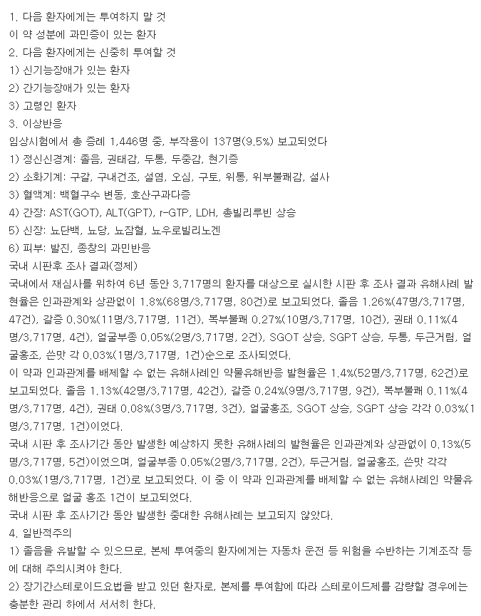 약물 복용 시 약품 설명서를 꼼꼼히 읽어 보시기 바라며, 조금이라도 이상반응이 느껴진다면 약품 복용을 즉시 멈추고 빠른 시일 내에 전문의와 상담을 통해 질병을 치료하시기 바랍니다.