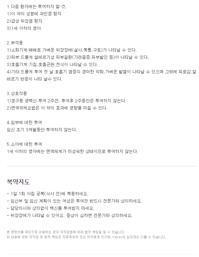 약물 복용 시에는 약품 안내서를 면밀히 읽어 보길 바라며, 조금이라도 이상반응이 느껴진다면 약품 복용을 즉시 멈추고 빠른 시일 내에 의사나 약사와 진료와 상담을 통해 질병을 치료하길 바랍니다.
