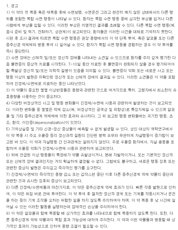 약품 성분별 약 효능으로는 Zolpidem Tartrate : 정신/행동장애 > 최면진정제 (수면제) > Non-Benzodiazepine계 > 단시간형의 약효를 지니고 있습니다.