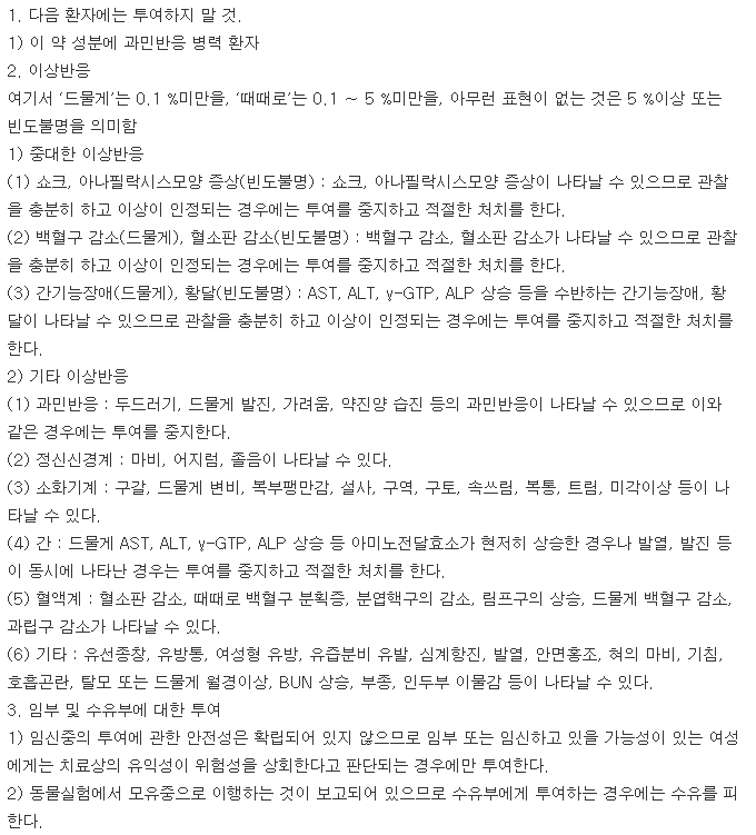 따라서, 약학정보원에 등록되어있는 밑의 주의사항을 반드시 세밀히 정독하고 부작용이나 이상반응, 고령자나 소아, 임부나 수유부에 관한 주의를 기울여야 합니다.