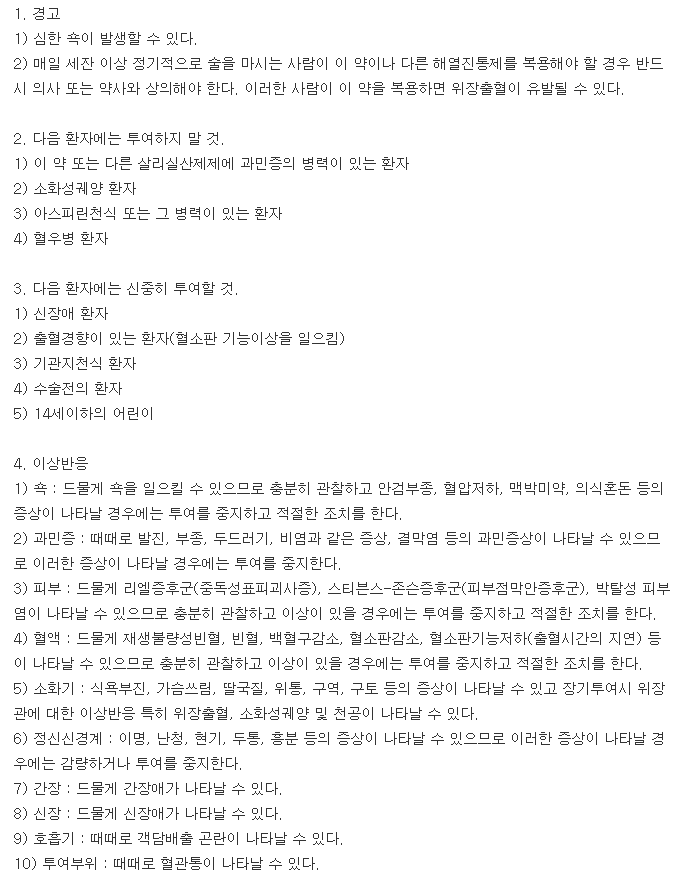 약물 복용 시 의약품 안내서를 꼼꼼히 읽어 보시기 바라며, 조금이라도 이상한 반응이 나타난다면 복용을 즉시 멈추시고 반드시 전문의와 진료와 상담을 통해 질병을 치료하길 바랍니다.