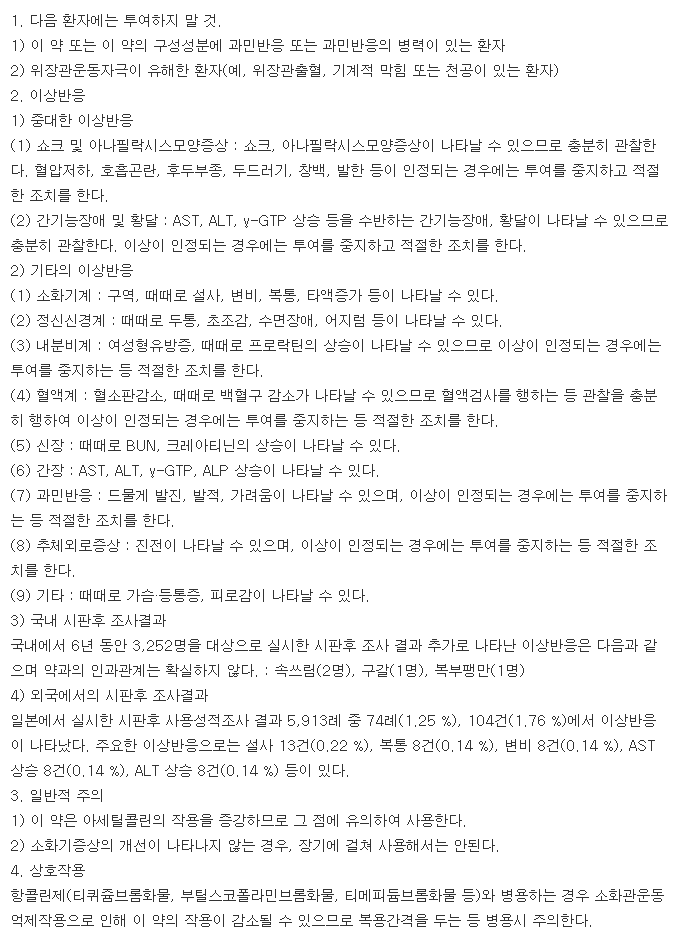 약물 복용 시에는 동봉된 의약품 설명서를 면밀히 읽어 보시기 바라며, 조금이라도 이상반응이 느껴진다면 복용을 즉시 중단하시고 빠른 시일 내에 전문의와 상담을 통해 질병을 치료하시기 바랍니다.