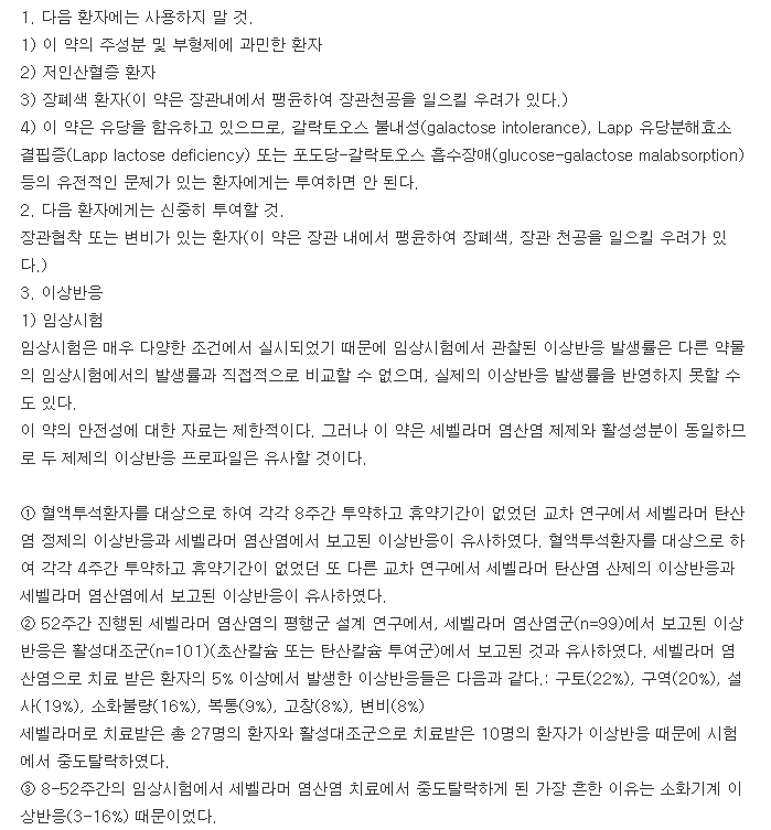인벨라정의 약 효능 : 투석을 받고 있는 만성 신장질환 환자의 혈청 인 조절
