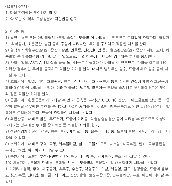 약물 복용 시에는 동봉된 약품 설명서를 자세히 읽어 보길 바라며, 조금이라도 이상한 반응이 나타난다면 약품 복용을 즉시 멈추시고 빠른 시일 내에 의사나 약사와 진료와 상담을 통해 질병을 치료하시기 바랍니다.